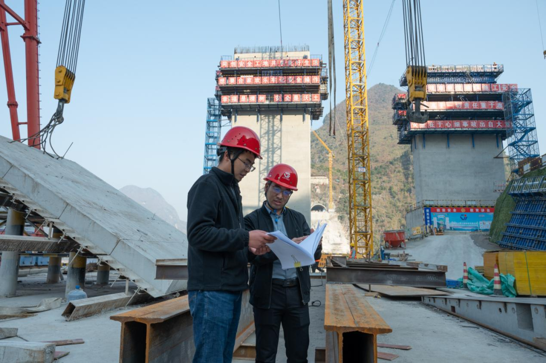 陈磊(右)在施工现场为技术人员讲解施工图纸
