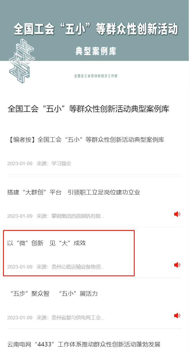 近日,贵州XPJ运输设备物资有限公司(简称:设备物资公司)向中华全国总工会申报的《以“微”立异见“大”效果》立异典范案例,乐成登上中华全国总工会“学习强会”平台 。