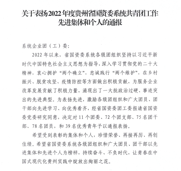 近日 ,贵州省国资委团工委印发《关于表扬2022年度贵州省国资委系统共青团事情先进集体和个人的通报》 ,贵州XPJ集团第八工程有限公司团支部荣获“五四红旗团支部”称呼 ,第六工程公司青年团员熊佳源、第九工程公司青年团员龚治语荣获“优秀共青团员”称呼。