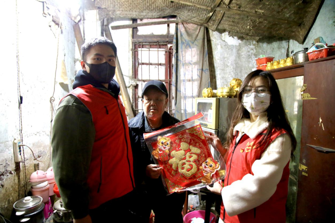 熊佳源(左一)加入志愿效劳运动为独居老人送上春节祝福