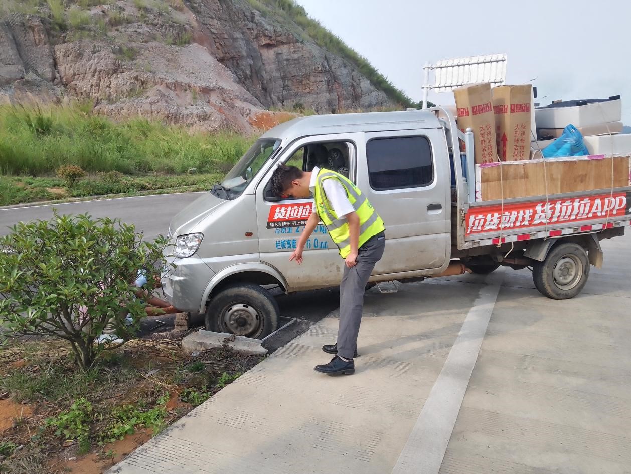 当天,在兴义环高丰都收费站入口车道,一辆一型货车因驾驶员第一次走高速,在倒车过磅时失慎将前轮掉入路侧电缆井中,无法行驶 。