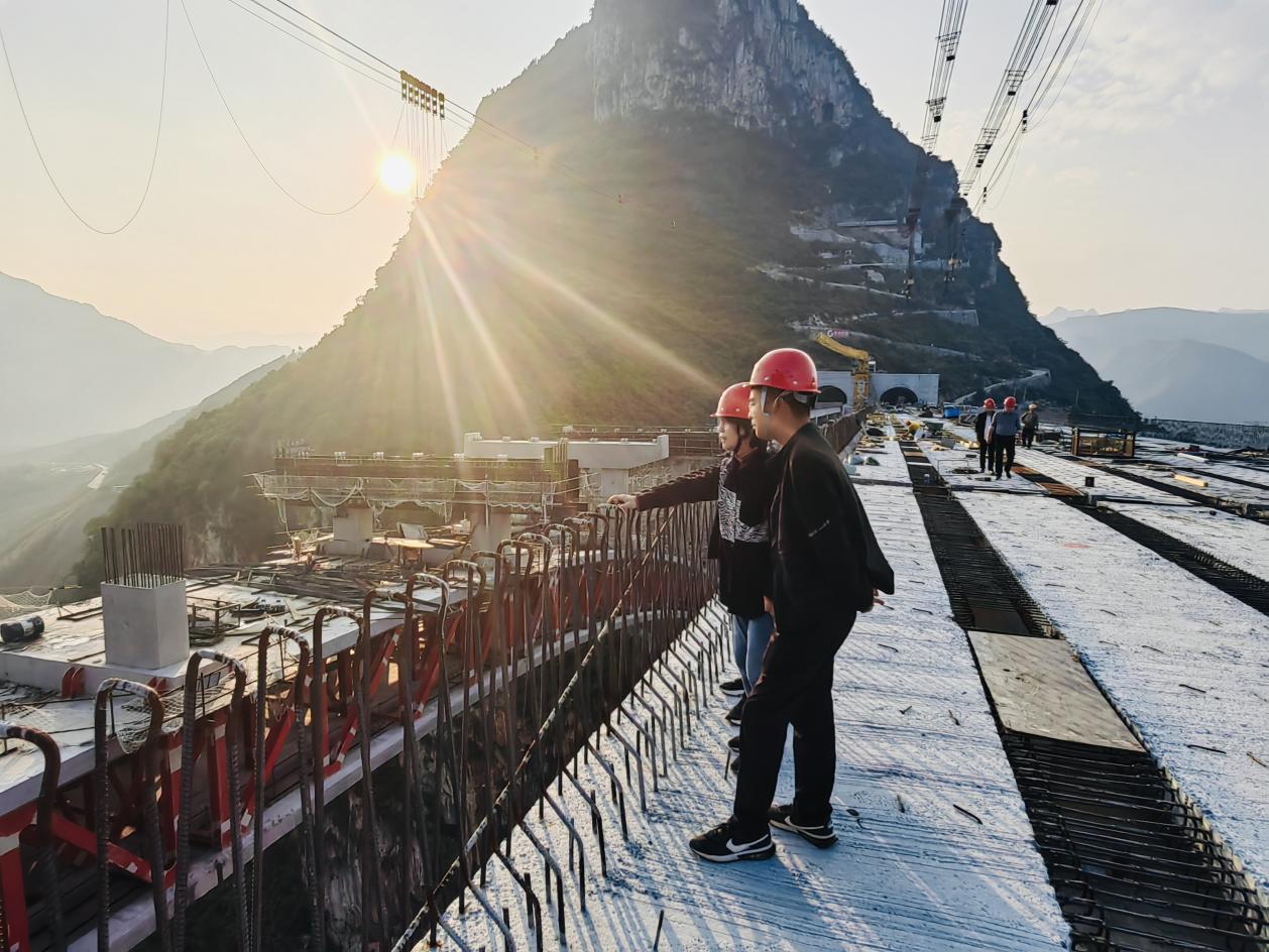 张胜林(右一)仔细检查乌蒙山大桥现场施工宁静防护步伐