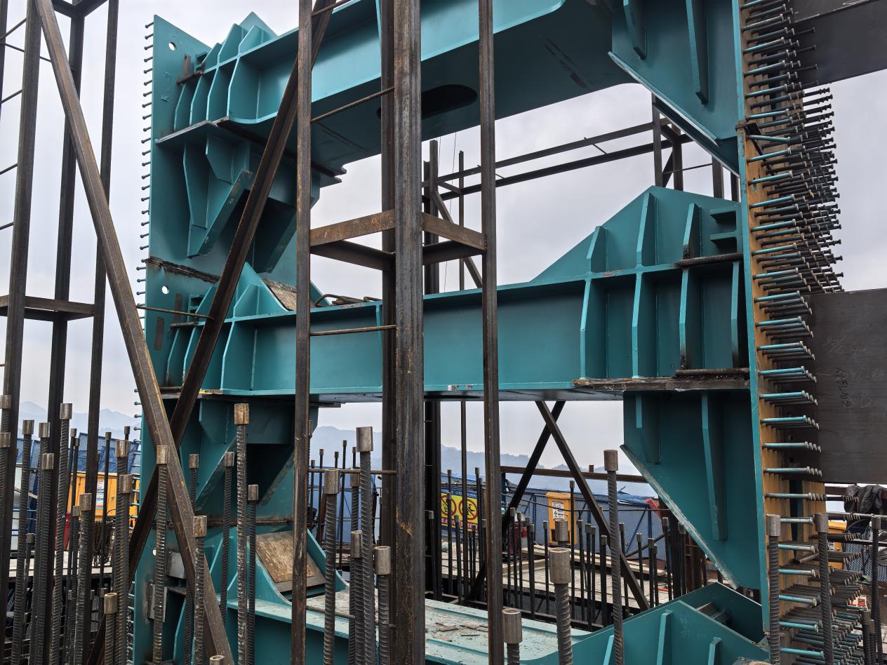 钢锚梁作为斜拉索锚固结构,设置于上塔柱,蒙受斜拉索的平衡水平分力,钢锚梁共23节,左右肢塔柱各23个,大桥第一个钢锚梁装置于上塔柱153.5米处,于2024年9月30日乐成装置。钢锚梁由锚梁和钢牛腿两部分组成,锚梁和钢牛腿之间接纳焊接连接,钢牛腿与塔柱接纳剪力钉连接。