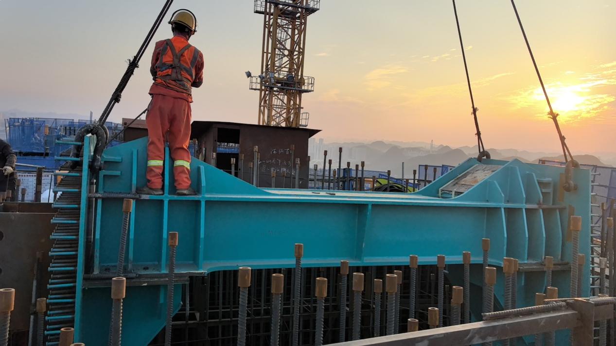 钢锚梁接纳钢整体吊装施工工艺,为确保吊装历程的宁静和精度,项目部接纳了地面型钢胎架进行整体组装,钢锚梁与钢牛腿用高强螺栓临时固结,然后用塔吊将钢锚梁整体吊装至塔柱内进行装置,乐成将高程偏差控制在2毫米以内,横桥向、顺桥向锚固点位置偏差控制在5毫米以内,为大桥的节节攀升打下坚实的基础。