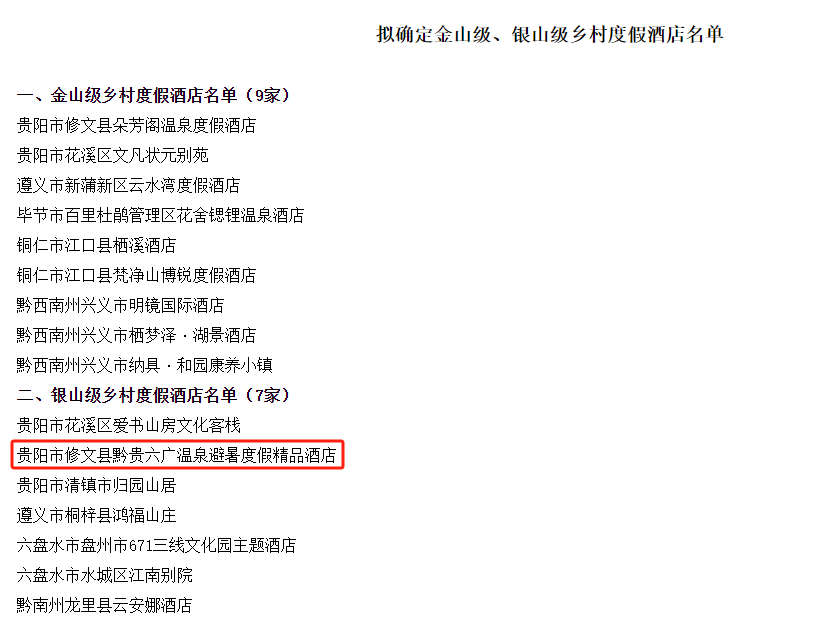 近日,从贵州省文化和旅游厅传来消息,黔贵六广温泉旅游景区“贵阳市修文县黔贵六广温泉避暑度假精品酒店”获评“银山级乡村度假酒店”。