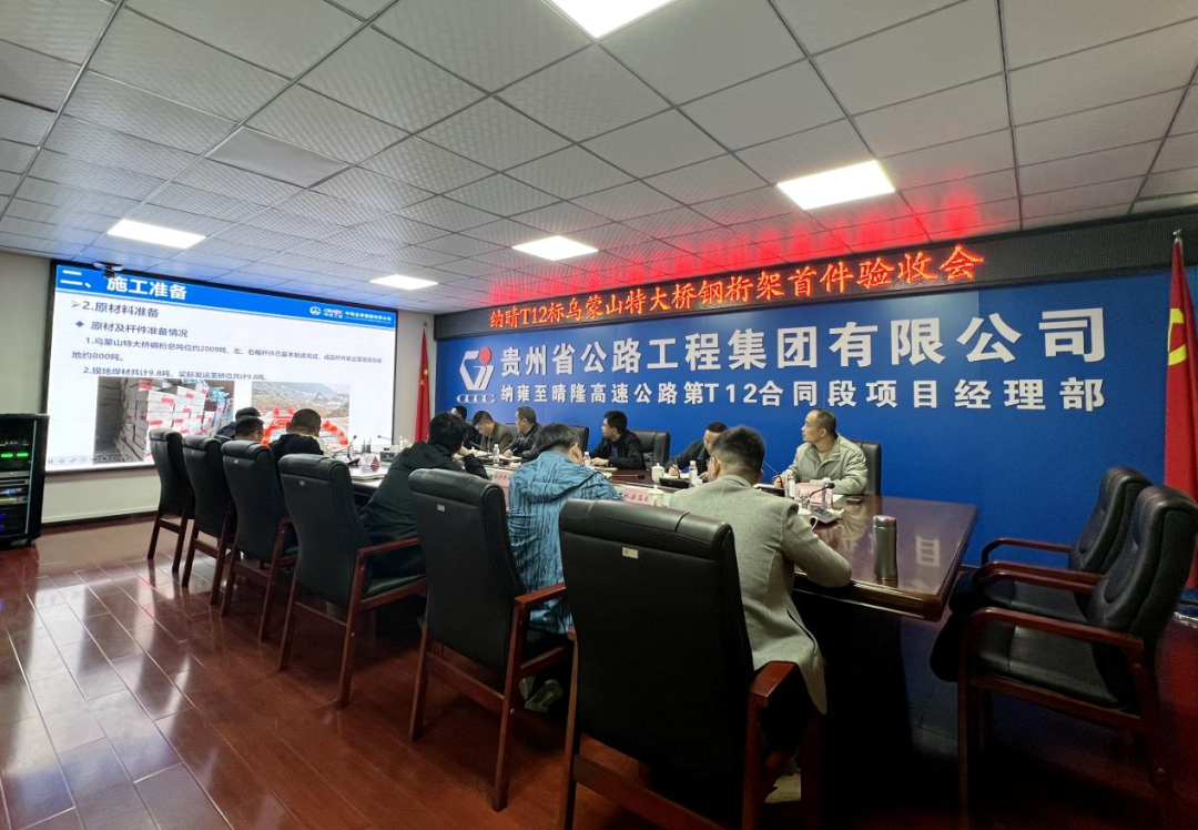 验收评审会上,验收组听取了纳晴12标《关于乌蒙山特大桥钢桁架首制件验收情况总结》的汇报以及第三方检测单位、桥梁监控单位、监理单位的审查意见,并通过检查纪录资料和问询等方法详细了解钢桁架拼装情况、进度计划安排、质量宁静包管步伐等情况。