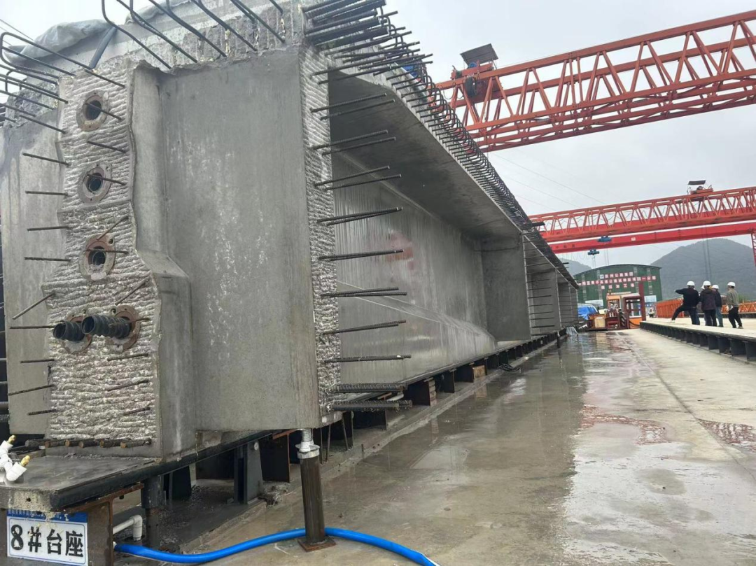 为确保T梁预制质量,在前期梁场建设历程中,项目部严格凭据标准化要求进行园地硬化、功效分区,并配置了钢筋数控弯曲中心,自动喷淋养护系统,2台30米跨径98T龙门吊,两套腹板胎膜架及一套顶板胎膜架 ;并且不绝优化施工计划,组织相关技术人员对钢筋制作、绑扎、模板拼装、混凝土浇筑等工序进行详细技术交底,严格凭据首件计划对各施工工序进行控制。