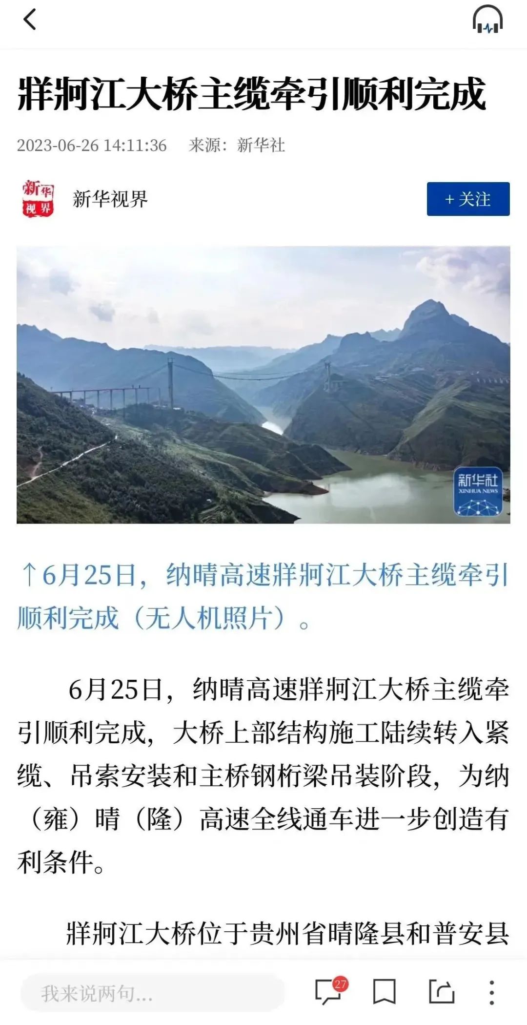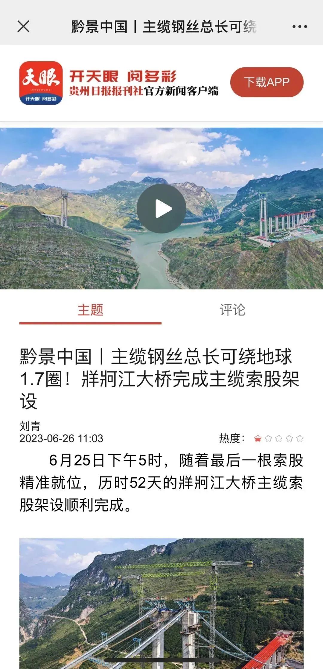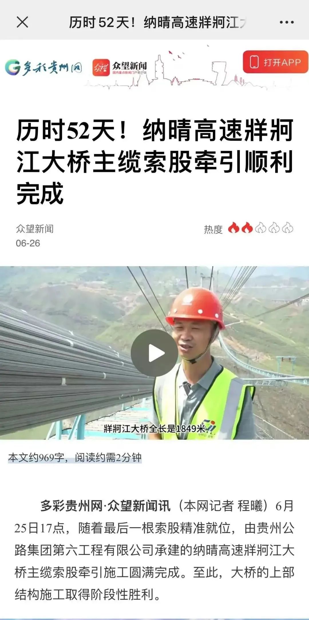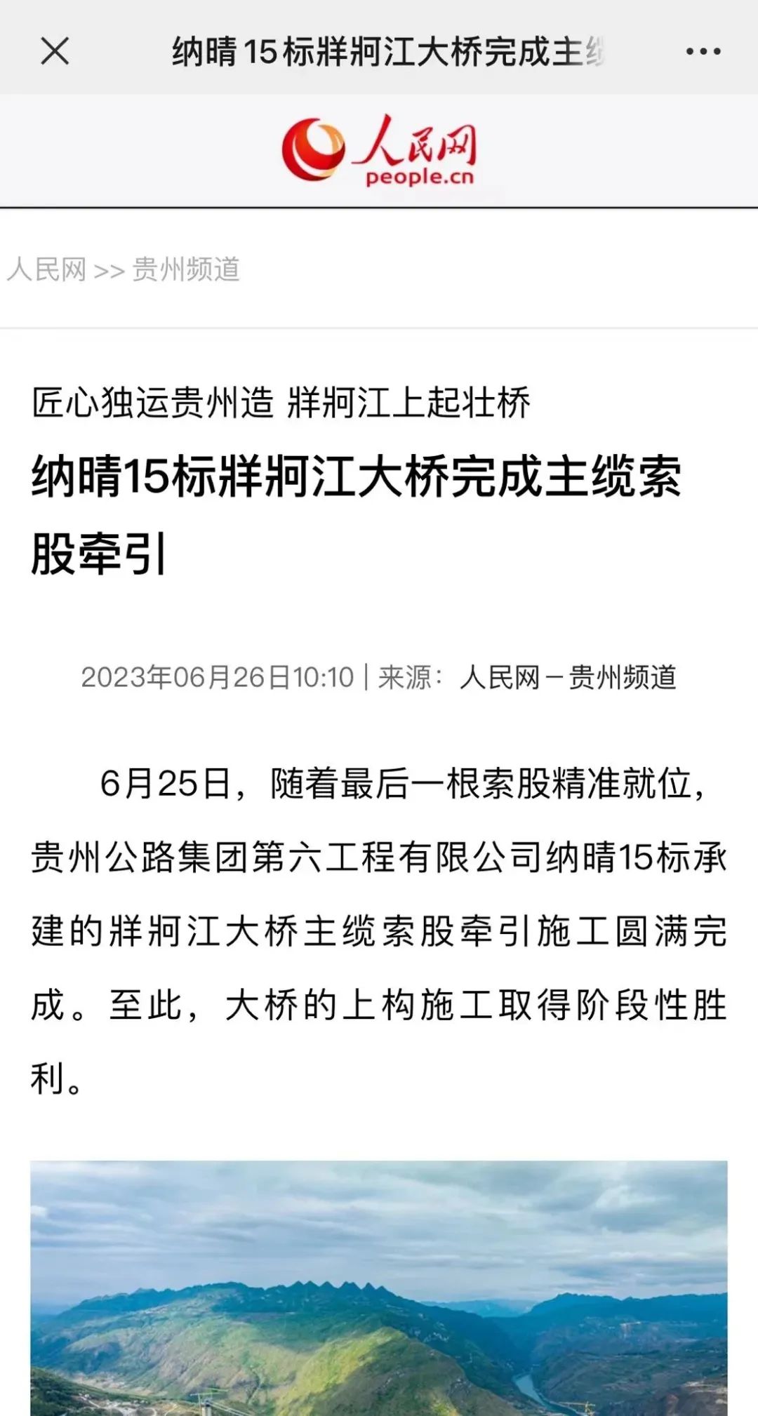 6月25日,新华社、中国交通报、贵州日报天眼新闻、贵州广播电视台、多彩贵州网等主流媒体记者走进由贵州XPJ集团第六工程有限公司承建的纳晴15标牂牁江大桥施工现场,聚焦牂牁江大桥主缆索股牵引施工,讲述贵州XPJ人高品质建桥的故事 。