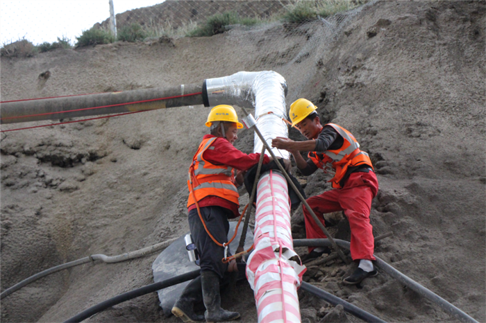 在布然隧道进口处,我们看见工人们正在用伴热带、保温棉、铝箔纸包裹管道。项目总工郭步玺看我一头雾水,便解释道,布然隧道隧址处于高寒、高海拔地区,每年有效施工时间仅有3月初至10月底的8个月时间,进入冬季后,室外的大桥、路基等就不具备施工条件了。可是项目部通过增加保温步伐,能够克服卑劣天气带来的影响,从而继续进行隧道施工。