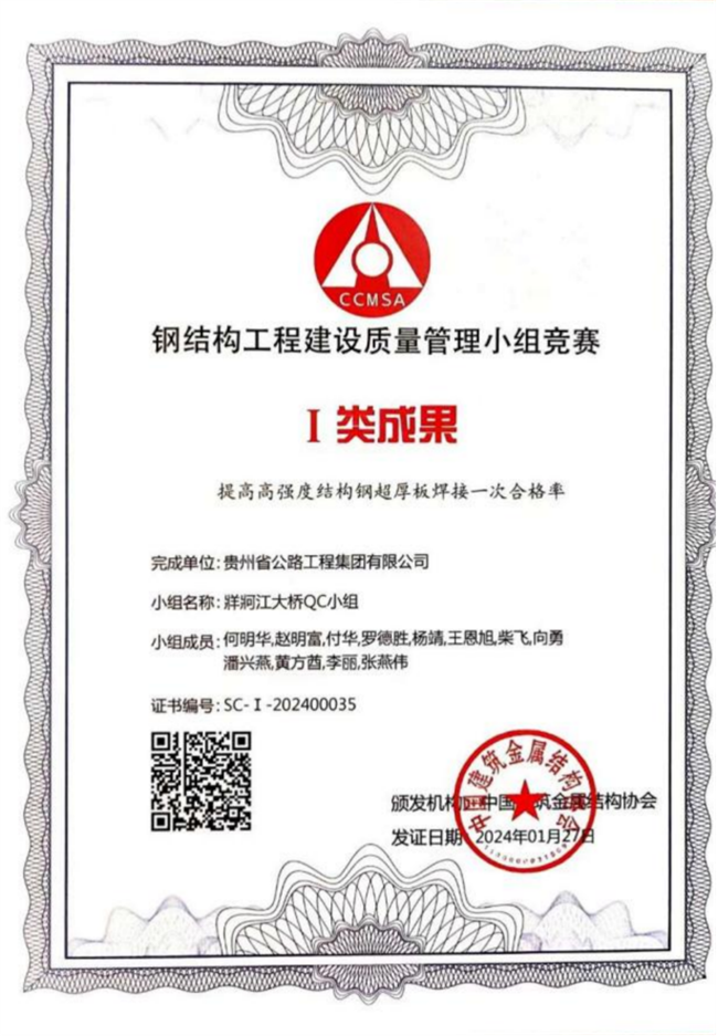 日前,由中国建筑金属结构协会主办的2023年钢结构工程建设质量治理小组竞赛运动优秀结果宣布会在北京召开,来自全国各地的220项质量立异和问题解决型项目进行了现场宣布和交流。由贵州XPJ集团纳晴15标牂牁江大桥QC小组申报的《提高高强度结构钢超厚板焊接一次及格率》在结果宣布中脱颖而出,获一类结果奖。