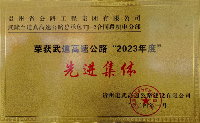 近日,由贵阳电气控制设备有限公司承建的武隆至道真高速XPJTJ-2条约段机电工程项目圆满完成2023年事情任务,在贵州道武高速XPJ建设有限公司年终评比中,荣获2023年度“先进集体”。