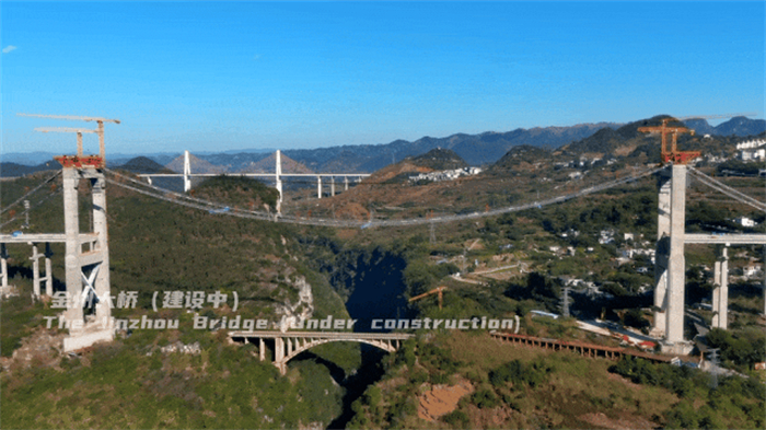 黔西南州金州大桥是连接兴义市和义龙新区的重要都会通道,跨越马岭河峡谷景物区,全长1600米,桥高235米,主桥跨径450米,于2020年初启动项目建设,预计2023年底建成通车。金州大桥是贵州省跨径最大的市政悬索桥,索塔接纳双柱直立门式框架混凝土结构。主跨接纳钢桁加劲梁,是贵州目前最高钢桁梁之一。大桥建成后也将成为兴义市的一座“新地标”,以及一张靓丽的都会新名片。