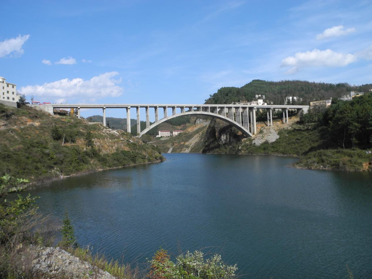 盘州鱼洞坝大桥主桥为1-110m钢筋混凝土上承式箱型无铰拱桥,引桥接纳预应力混凝土空心板,桥梁全长253m。